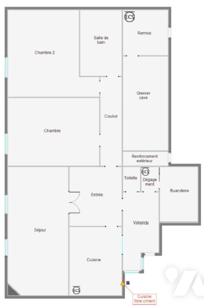 Ce bien est composé : entrée, séjour de 23m2, cuisine aménagée, dégagement pour deux chambres de 20.83m2 et 17.69m2, salle de bains avec douche et WC. Véranda distribuant local chaufferie, buanderie et WC